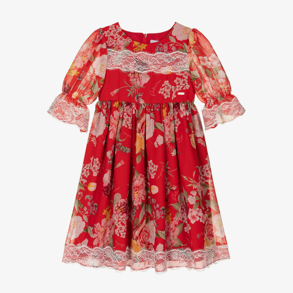 Beautiful red special occasion dress for girls by classic Portuguese designer Patachou, exclusive to Childrensalon. Made in soft, lightweight chiffon, it has a lovely floral and logo print in pink, green and orange, with white lace trims. The dress has puffed sleeves with gently elasticated, frilled cuffs and a full, gathered skirt. There is a double lining of lightweight voile for comfort, and a concealed zip fastening around the back.