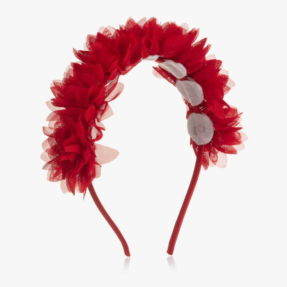 Exclusive to Childrensalon, a gorgeous red flower hairband for girls by Portuguese brand Patachou. The satin-covered slim band is decorated with a row of lovely chiffon flowers, giving it a romantic and beautiful finishing touch.