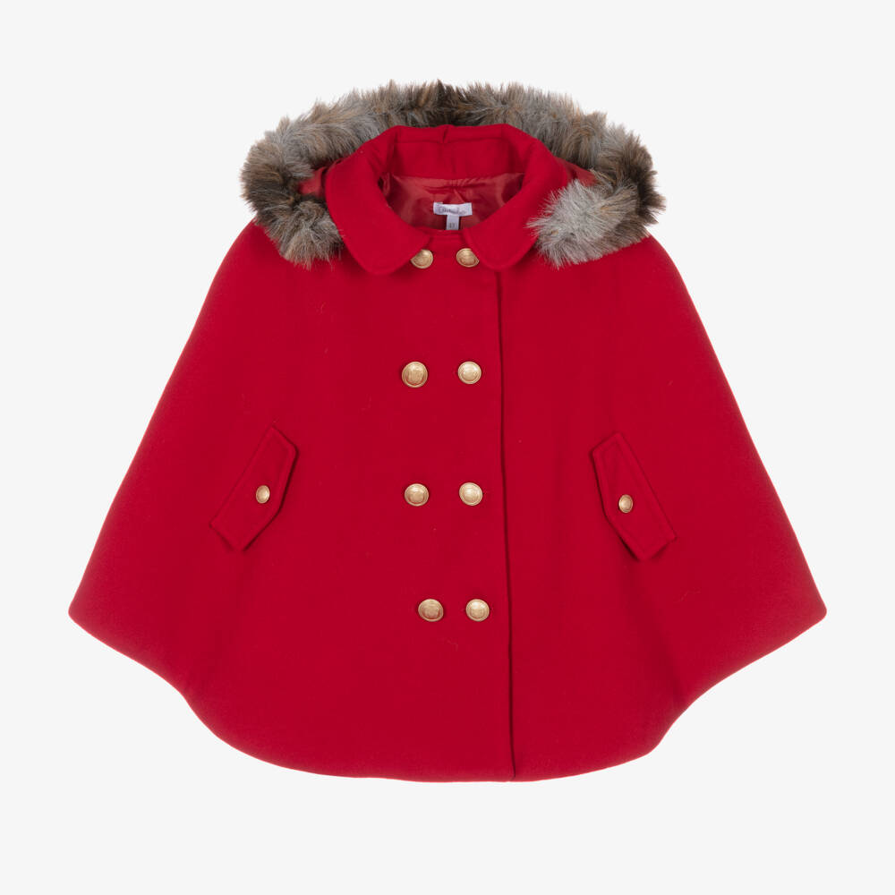 Exclusive to Childrensalon, this elegant red cape for girls by Patachou is made in a beautifully soft felted fabric, with a silky lining. It fastens at the front with gold crested buttons and has faux pocket flaps and arm holes on the sides. A decorative bow on the back gives it a pretty finish. The hood attaches with buttons and is trimmed with soft faux fur, for an extra cosy feel.