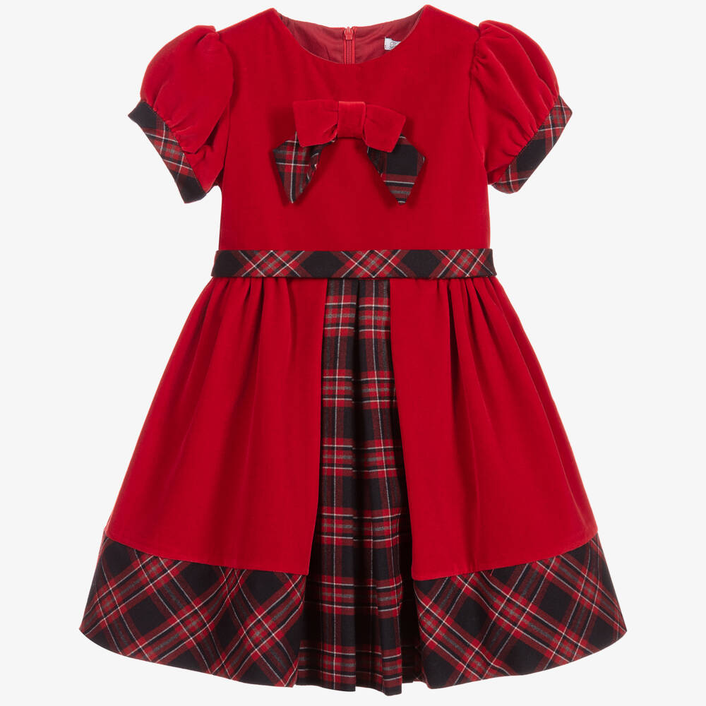Gorgeous red velvet dress for girls, by Patachou. Lined with cotton, it has red and navy blue tartan trims with a lovely red velvet bow on the bodice and puffed sleeves.