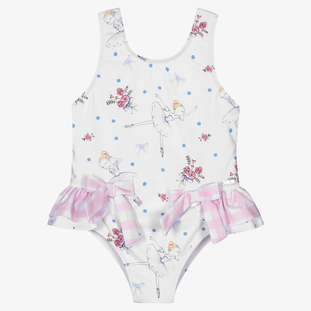 Pretty white swimsuit for girls by Patachou, with a ballerina, pink roses and pale blue polka dot print. Soft and silky, it has a silver metal logo tab on one side with fixed pink gingham bows. There are pink gingham and blue polka dot ruffles around the hips and across the back, and it is fully lined for comfort.