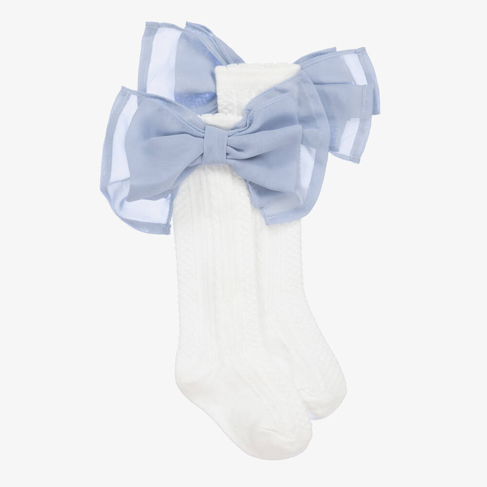 Pretty white socks for younger girls by Patachou, finely knitted in a soft and stretchy cotton blend. Patterned with a pointelle diamond design, these sweet knee-length socks have oversized dusky blue chiffon bows on the cuff to finish off an outfit.