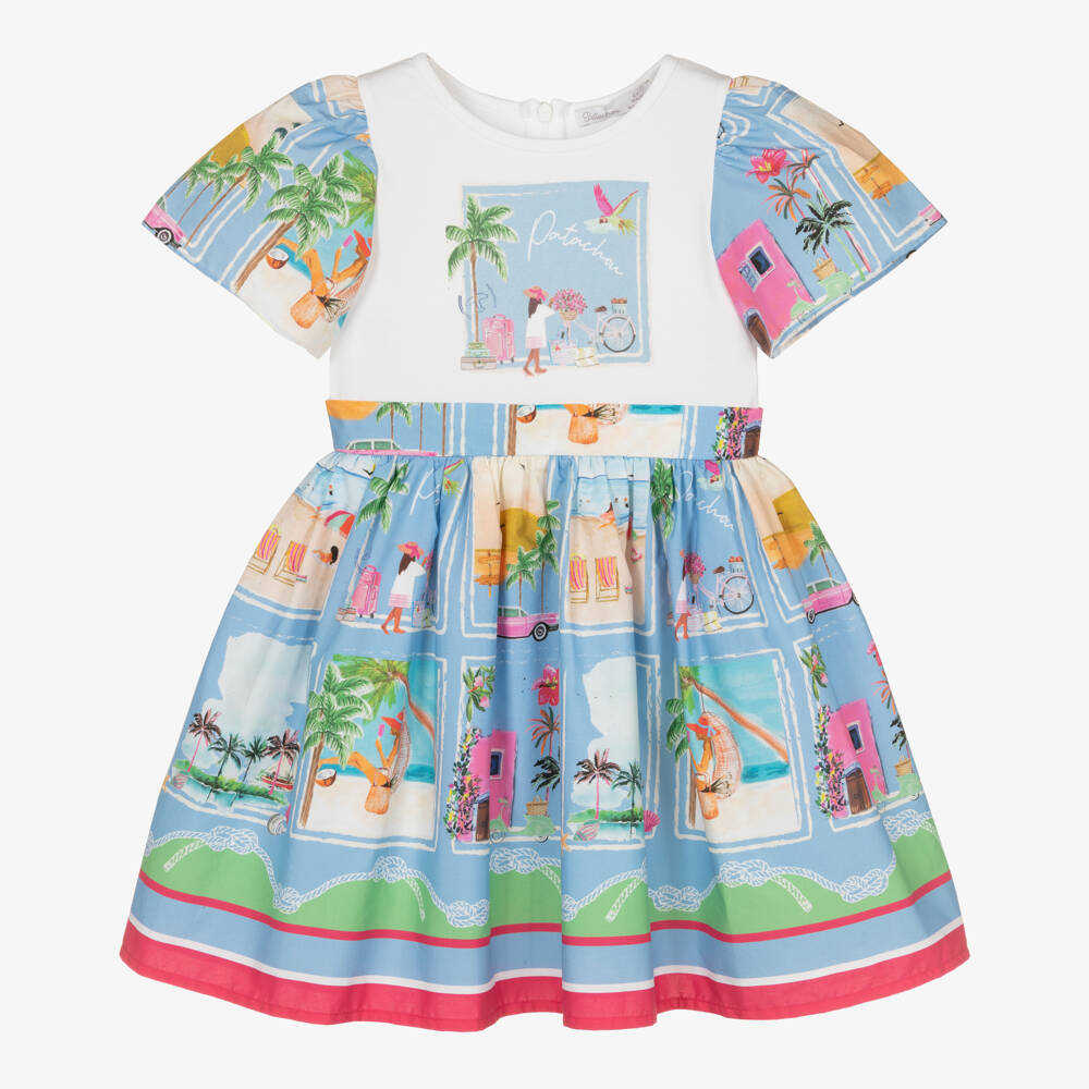 Girls white and blue dress from Patachou, made in soft cotton jersey and poplin blend. It has a holiday postcard print with pops of bright colours for a fun finish. One postcard within the skirt is printed on the chest of the white jersey top. It has capped sleeves and a flared skirt for a beautifully feminine shape. A concealed zip fastening on the back makes dressing quicker.