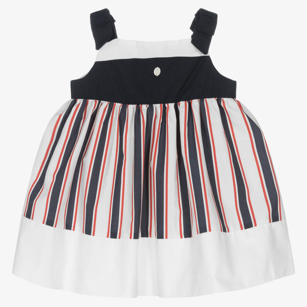 A smart white cotton dress for girls by Patachou, with red and navy blue nautical-inspired stripes. So pretty, the navy blue shoulder straps have a sweet bow detailing on each. It fastens with branded pearlescent buttons on the back and there is a monogram charm attached to the front for subtle branding. It is made and lined in soft and lightweight cotton for optimum comfort.