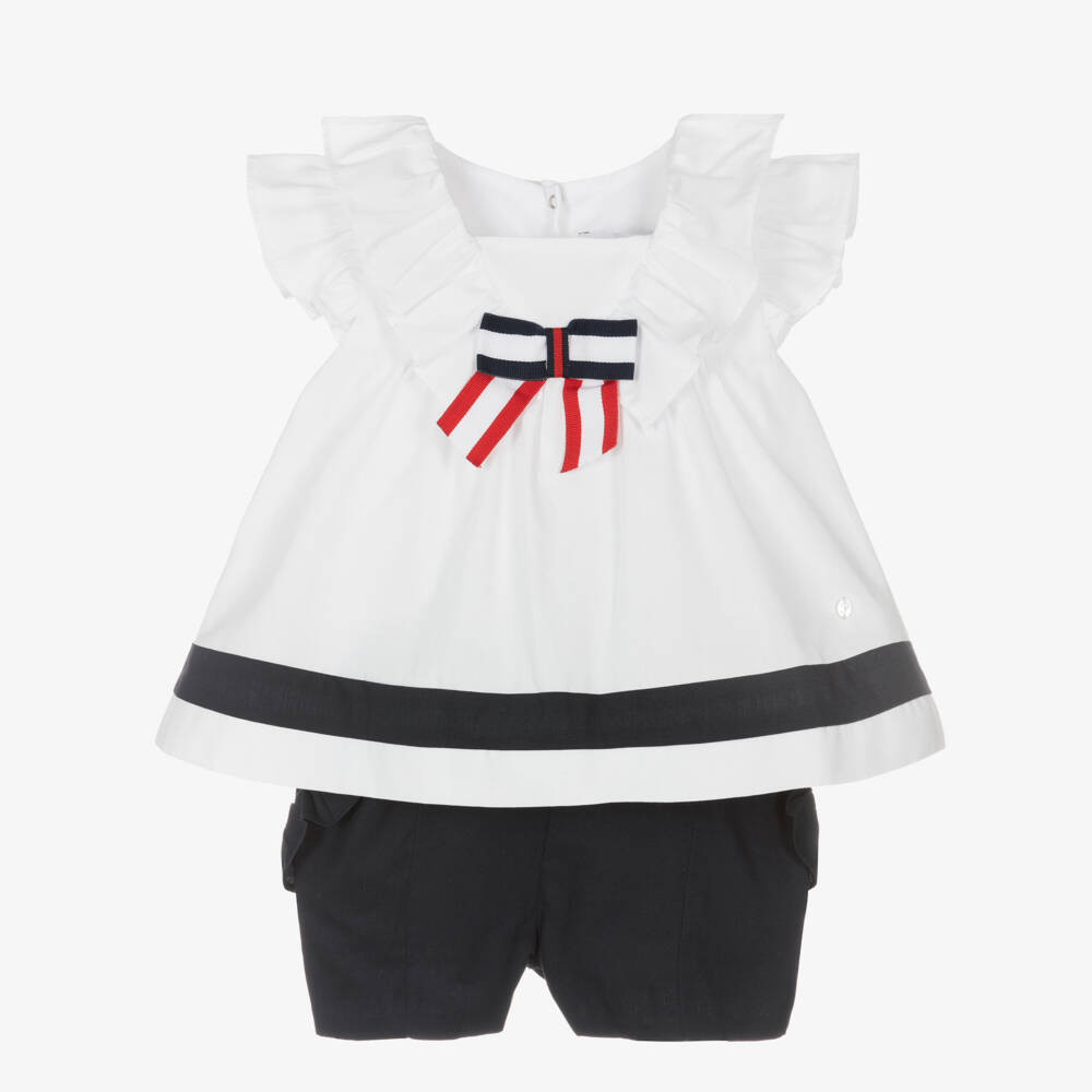 White and navy blue shorts set for girls by Portuguese brand Patachou, made in the softest cotton poplin. For a touch of heritage charm, the blouse features a ruffled bodice, frilled sleeves and a ribboned bow appliqué. It has a navy blue hemline and popper fastenings on the back. The shorts have decorative pearlescent buttons, ruffles on the sides and an elasticated back to beautifully finish the outfit.