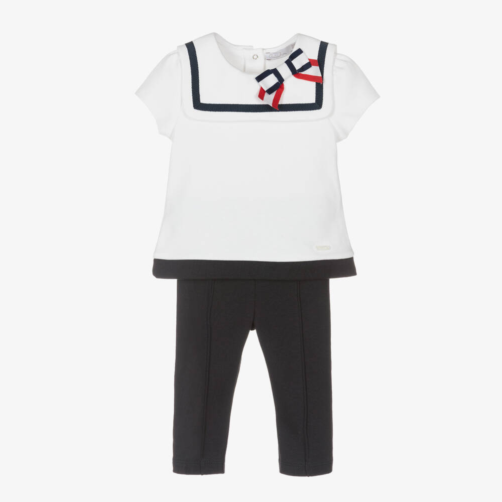 Nautical white and navy blue trouser set for girls by Portuguese brand Patachou, made in soft, comfortable cotton jersey. The T-shirt has a bib front with ribboned trim and a bow appliqué for a traditional, heritage style. There is a pearlescent charm logo on the front, and useful popper fastenings on the back. The trousers have neat seams on the front, and a comfortable elasticated waist.