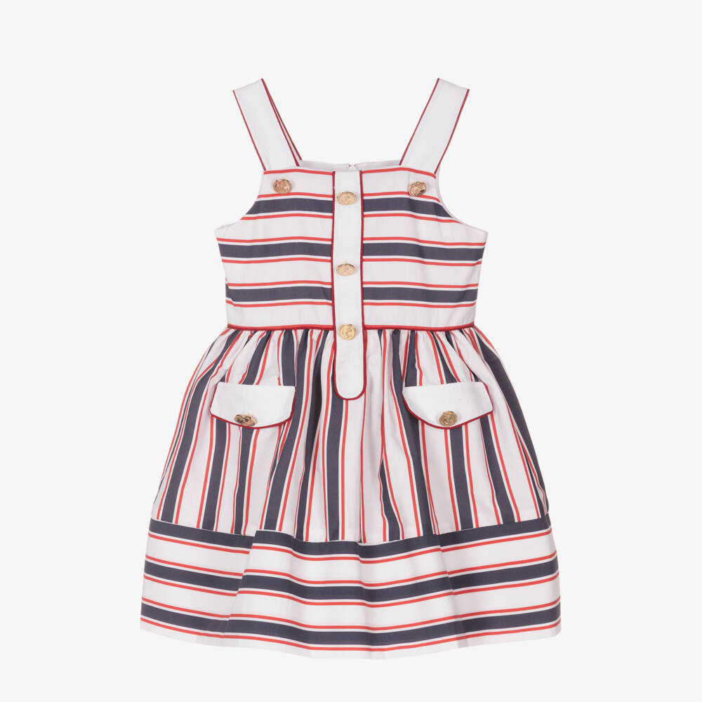 White nautically-inspired cotton dress for girls by classic Portuguese brand Patachou, made in comfortable poplin. Striped in navy blue and red with red piping, it has decorative shiny gold buttons embossed with anchors on both the front and the faux pockets. It fastens with a neat, concealed zip around the back and is fully lined in voile for comfort.