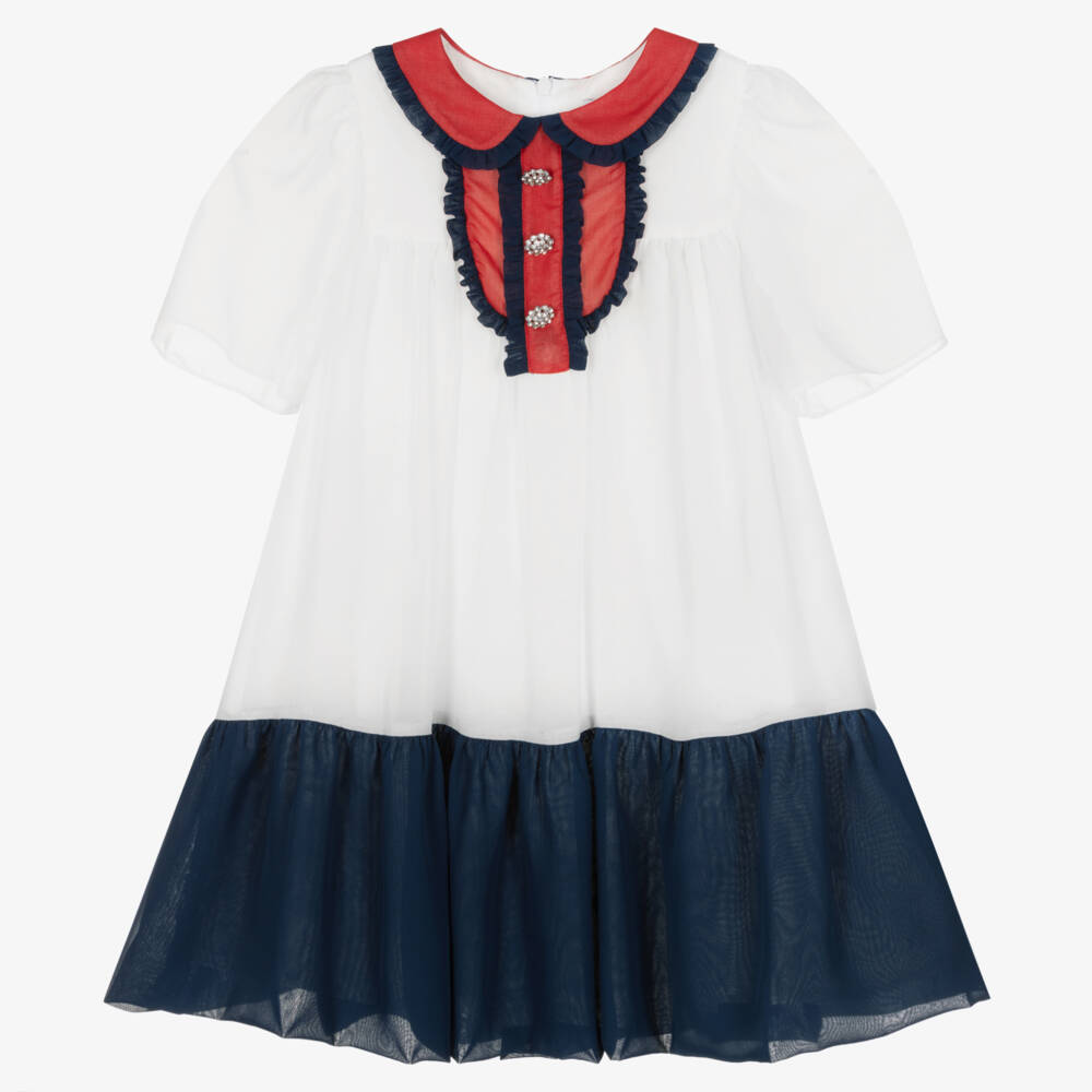 Pretty white dress for girls by classic Portuguese brand Patachou, made in sheer chiffon. Ideal for a special occasion, it has a red collar and bib, trimmed in navy blue frills and sparkling with decorative diamanté buttons. Gently gathered below the bodice, it has a deep, navy blue hemline and a double voile lining for comfort. It fastens with a concealed zip around the back.