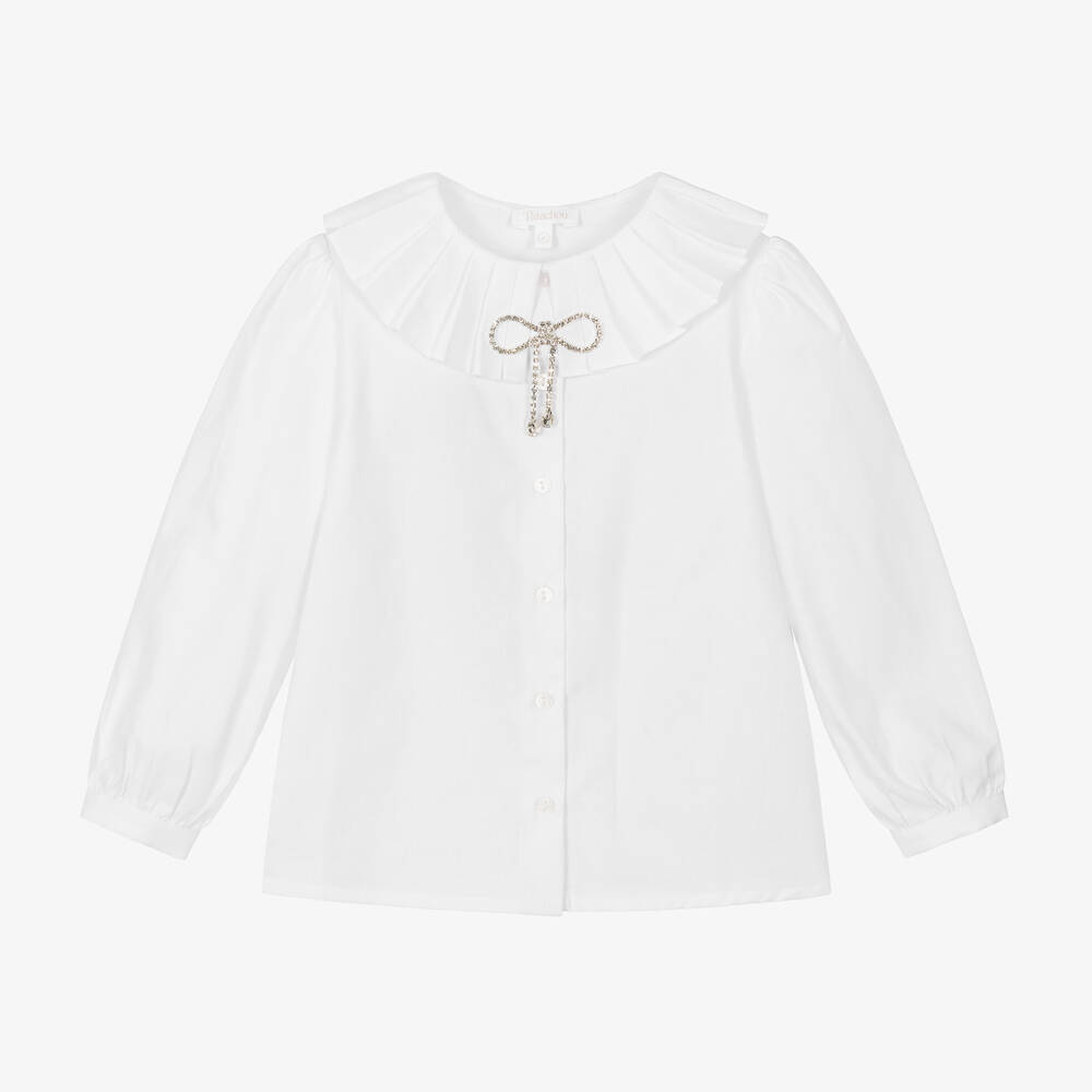 Exclusive to Childrensalon, this white blouse for girls is by Patachou. Made from soft cotton twill, it has a statement pleated collar and a pretty diamanté bow embellishment on the neckline for a sparkly touch. Chic yet preppy, it has puffed long sleeves with buttoned cuffs and fastens with pearlescent branded buttons on the front.