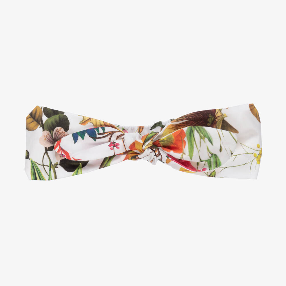 Gorgeous white cotton headband for girls by luxury brand Patachou, with a colourful floral print. Made in soft poplin, it has an attached bow on the top and an elasticated panel around the back for a secure fit.