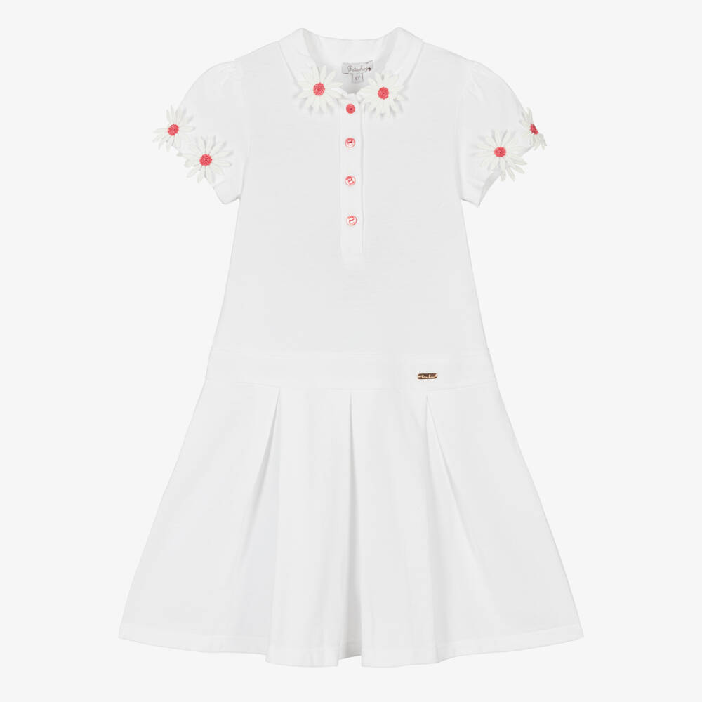 Girls can channel tennis style in this lovely white polo dress from Patachou. Stitched on the collar and capped sleeves are sweet white fabric flowers with pink embroidered centres, complementing the rose-hued pearlescent front buttons for a coordinated look. This sports-luxe look is made in soft and stretchy cotton piqué, with an on-trend dropped waist and box-pleated skirt. The brand's rose gold logo plate is stitched on the waist to finish the design.