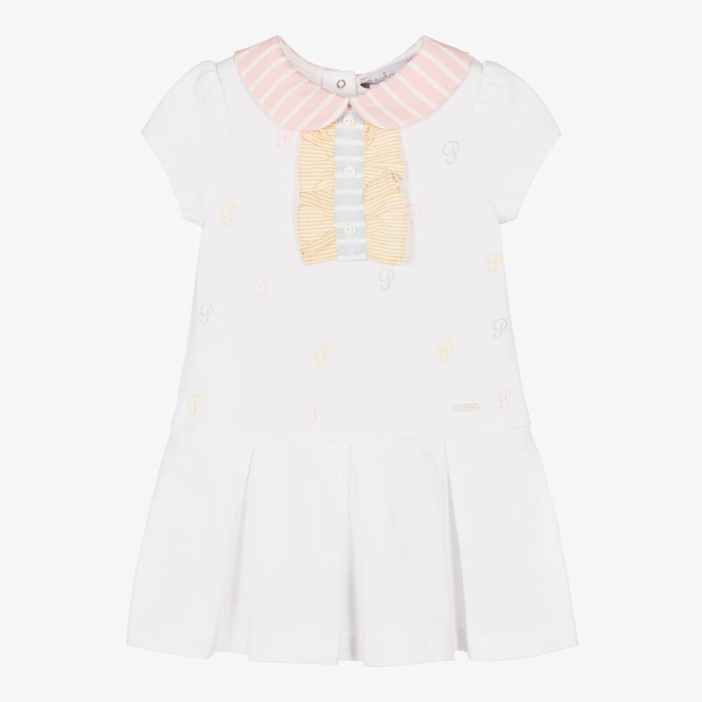 White dress for girls by Portuguese brand Patachou, made in soft and breathable cotton piqué. This sporty style dress has colourful intricate 'P' embroideries with a striped collar and ruffled trims on the decorative front buttons fastenings. There is a pearlescent logo charm logo on the front and useful popper fastenings on the back.