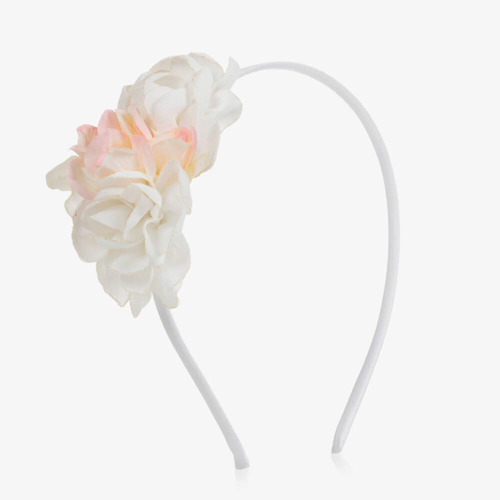 Pretty white hairband for girls from Patachou, with fabric 3D flowers on one side for a feminine finish. The band is flexible and covered with satin for a comfortable fit.