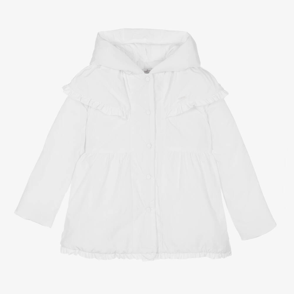 White hooded coat for girls by Portugese brand, Patachou. The fabric has a silky feel and is soft and lightweight, with mid-weight padding for warmth. There are tiered ruffle trims and front popper fastenings, with pockets at the side. The lining is made in soft cotton jersey for comfort.