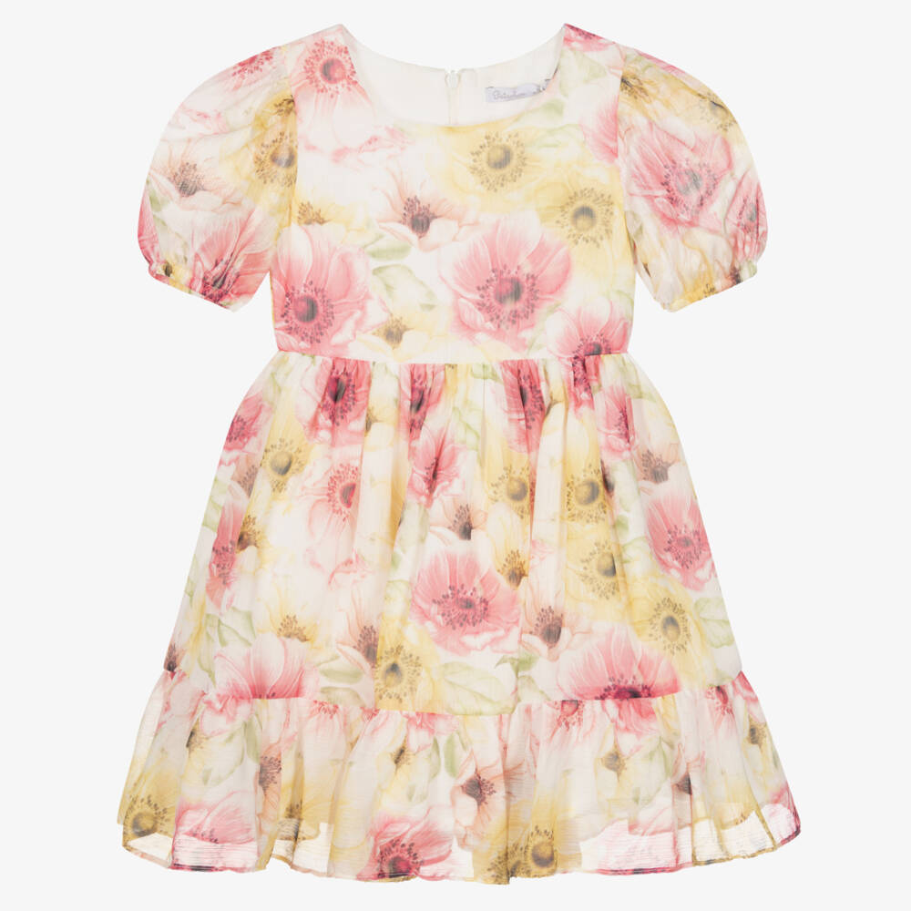 Pretty white chiffon dress for girls by classically-styled Portuguese brand Patachou. Lightweight and with a textured feel, it has a pink, yellow and green floral print. The sheer, puffed sleeves have gently elasticated cuffs and the gathered skirt has a frilled hemline. The double lining is made in cotton voile for comfort and the back zip fastening is concealed for a neat finish.