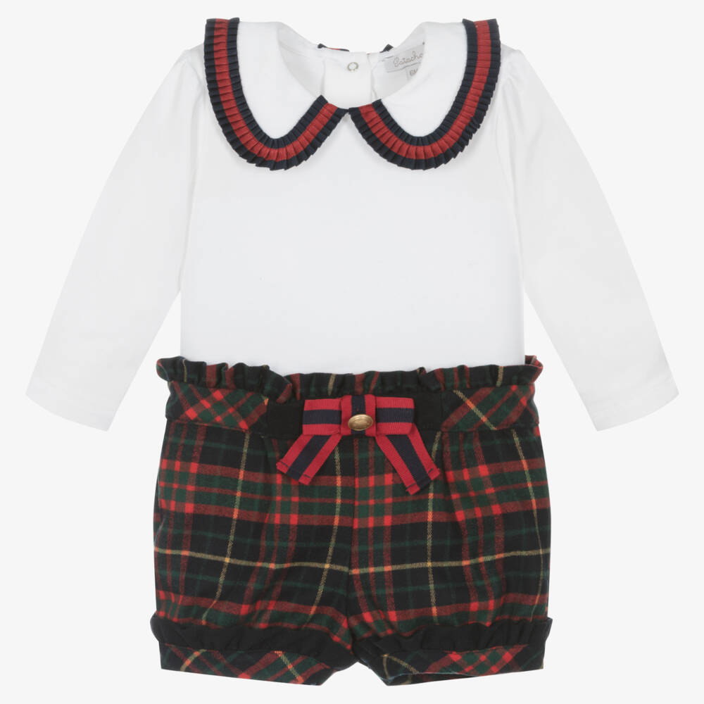 Girls White & Red Tartan Shorts Set
