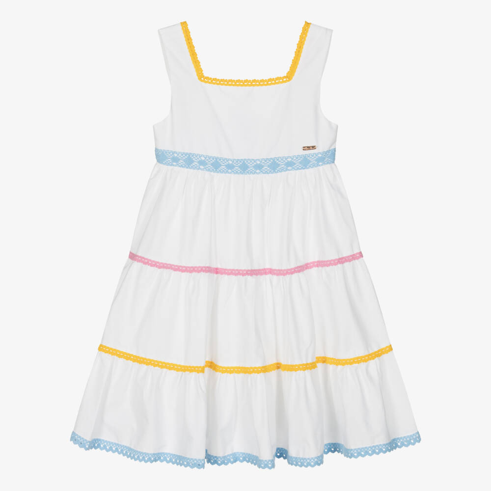 Beautiful white dress for girls by Patachou, made in soft cotton poplin for sunny days. It has lovely crochet lace trims on the bodice and skirt in yellow, blue and pink, adding a vintage-inspired touch to the tiered layers. Lined in soft cotton for comfortable wear, it fastens with a concealed zip on the back for a seamless finish. A rose gold logo charm decorates the bodice with a touch of branded sparkle.