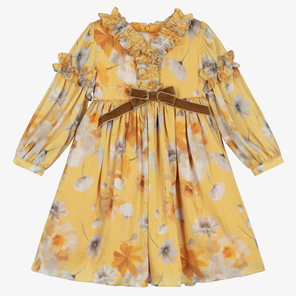 In a lovely yellow and grey floral print, this special occasion dress for girls is by Patachou. Made in gorgeous silky chiffon which drapes beautifully, it has gently puffed sleeves, feminine ruffle trims, and a pretty velvet bow on the front. This elegant dress is lined in lightweight cotton for comfort, and fastens discreetly with a concealed zip on the back.