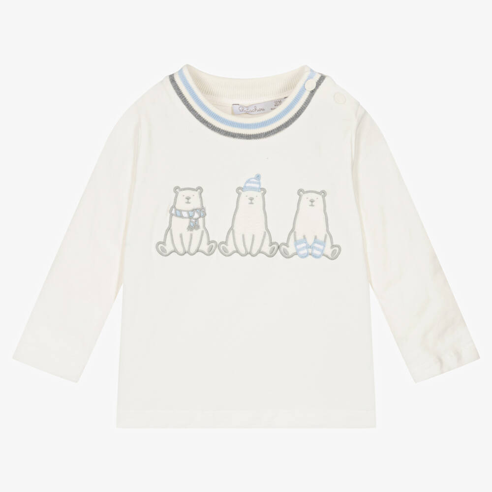 Ivory long-sleeved top for boys by Patachou, with cute polar bear appliqués on the front and embroidered detail in grey and blue. Made in super soft cotton jersey, this useful wardrobe staple has a casual ribbed crew neck with blue and grey stripes. To help with dressing, there are branded popper fastenings on one shoulder.