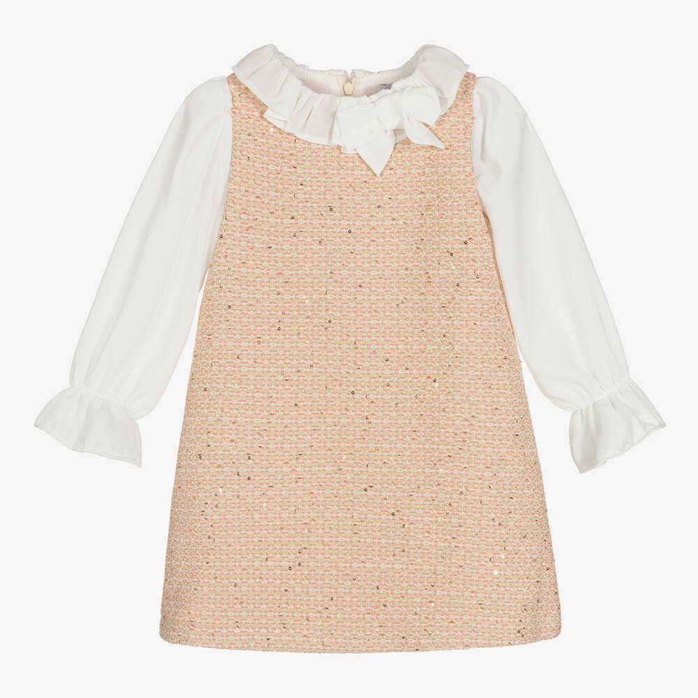 Ivory, beige and pink tweed dress for girls by Patachou, with sparkly gold sequins. This gentle A-line style has an ivory crêpe chiffon ruffle collar with bow detail and matching sleeves with elasticated ruffle cuffs. Lined in lightweight cotton, it fastens with a concealed zip on the back.