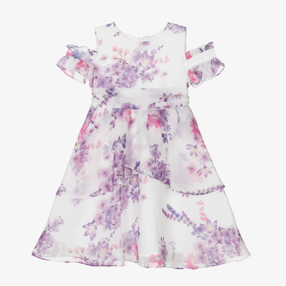 Beautiful ivory dress for girls by Patachou, exclusive to Childrensalon. Crafted in beautifully soft chiffon, the fabric is patterned with stunning purple and pink flowers for a truly feminine look. A ruffled open-shoulder detail, sash to tie into a bow on the back, and cascading tulip-effect layers on the skirt add elegance to this lovely piece. The cotton lining is soft and comfortable, and the dress fastens with a hidden zip on the back for a neat look.