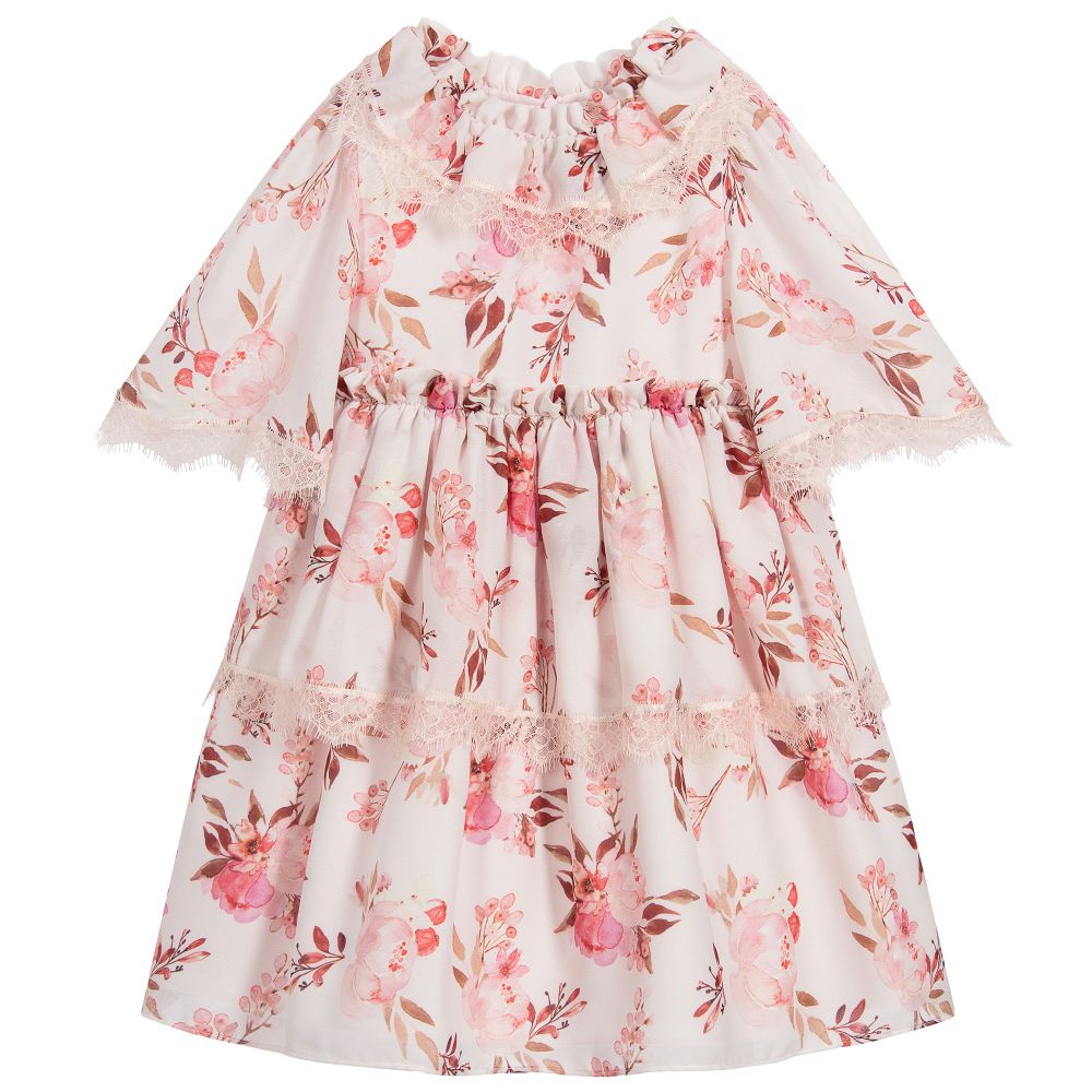 Lovely pale pink dress for girls by Patachou, with a pretty pink and brown floral print. Made in soft, lightweight chiffon, it has frills around the neck and waist, with delicate lace trims. The lining has a net frill for extra volume.