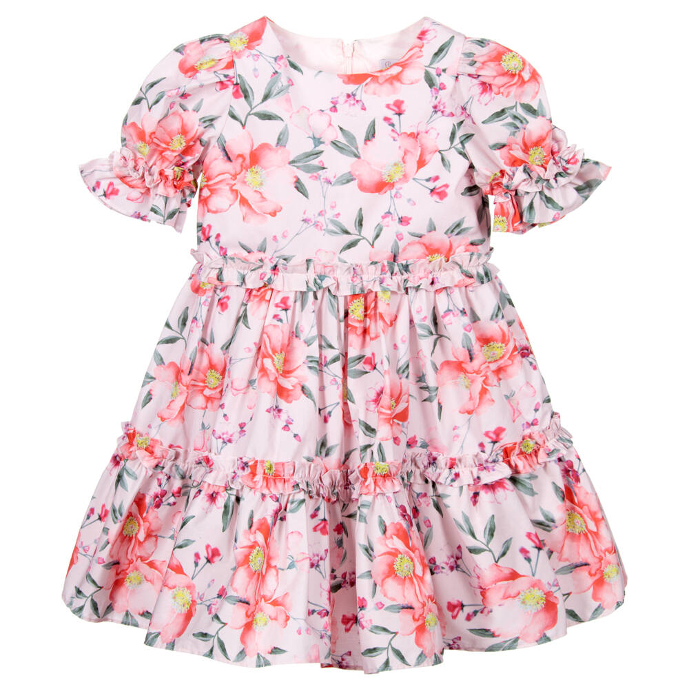 Pretty pink dress for girls by Patachou, with a contrasting pink floral pattern. Made in soft, lightweight cotton, it has frills on the puffed sleeves, waist and skirt. The bodice is lined for comfort.