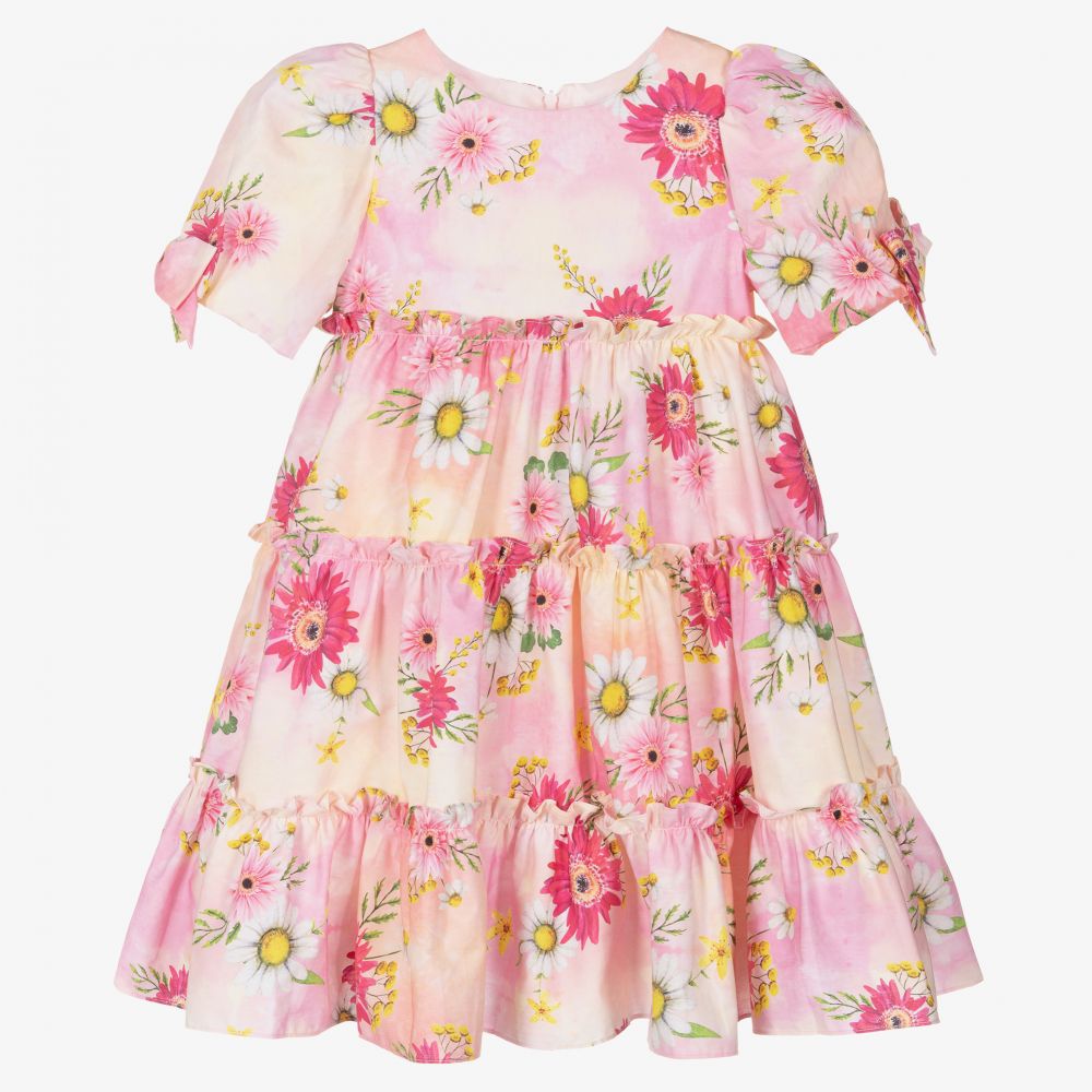 Gorgeous pink and yellow tie-dye dress for girls by Patachou, with a contrasting pink, white and yellow floral print. Made in lightweight cotton poplin, it has large puffed sleeves with fixed bows and a full, frilled tiered skirt.