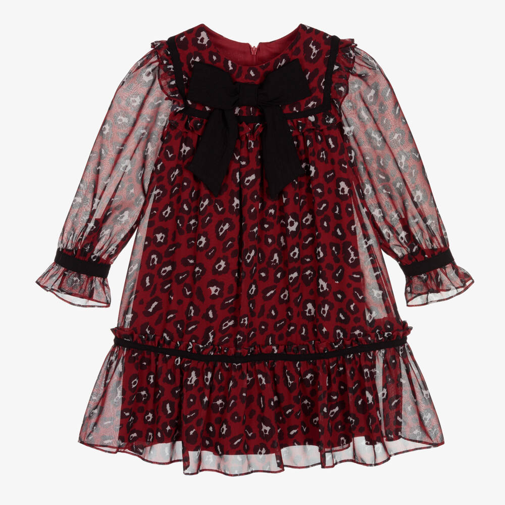 In red, black and white, this stylish leopard print dress for girls is by Patachou. Made in sheer chiffon, it has elegant ruffles, black trims and a large bow on the bodice. Lined in lightweight cotton, the dress has sheer sleeves and a concealed zip fastening on the back.