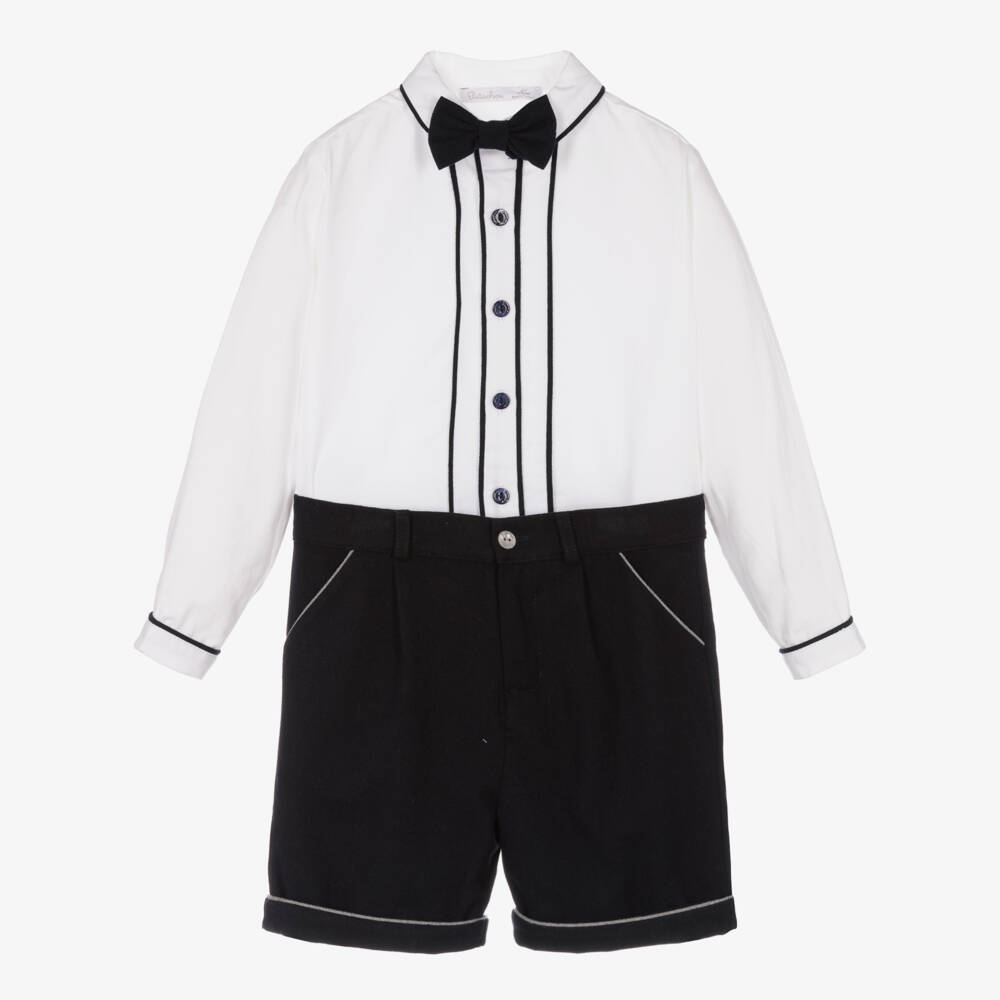 A smart shirt and shorts set for boys by Patachou, ideal for special occasions. Made in soft, lightweight cotton, the classic white shirt has navy blue piping detail with matching button fastenings. It comes with a sweet, detachable bow tie, secured with buttons underneath the collar. The matching blue turn-up shorts have grey piping detail and two front pockets. They are fastened with a zip and button closure, with an adjustable waistband for a growing little one.