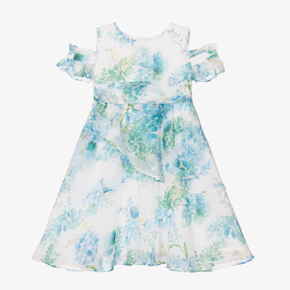 Beautiful white dress for girls by Patachou, exclusive to Childrensalon. Crafted in beautifully soft chiffon, the fabric is patterned with stunning blue and green flowers for a truly feminine look. A ruffled open-shoulder detail, sash to tie into a bow on the back, and cascading tulip-effect layers on the skirt add elegance to this lovely piece. The cotton lining is soft and comfortable, and the dress fastens with a hidden zip on the back for a neat look.