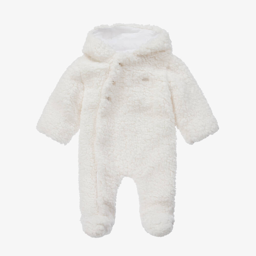 White hooded pramsuit for baby boys and girls from Patachou. Its soft and cosy fleece material, cotton jersey lining and lightweight padding will help to keep baby warm, cosy and comfortable. For a smart look, it has decorative buttons and a pearlescent logo charm stitched on the front. Beneath this are popper fastenings for simple, fuss-free dressing.