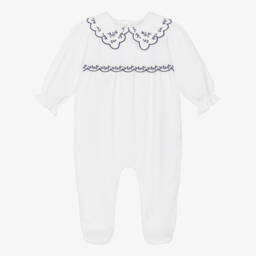 White babygrow for boys and girls by Patachou, made in soft, comfortable cotton velour. This cosy one-piece features adorable teddy bear embroidery across the bodice in red, with a classic collar and cuffs trimmed in festive tartan.