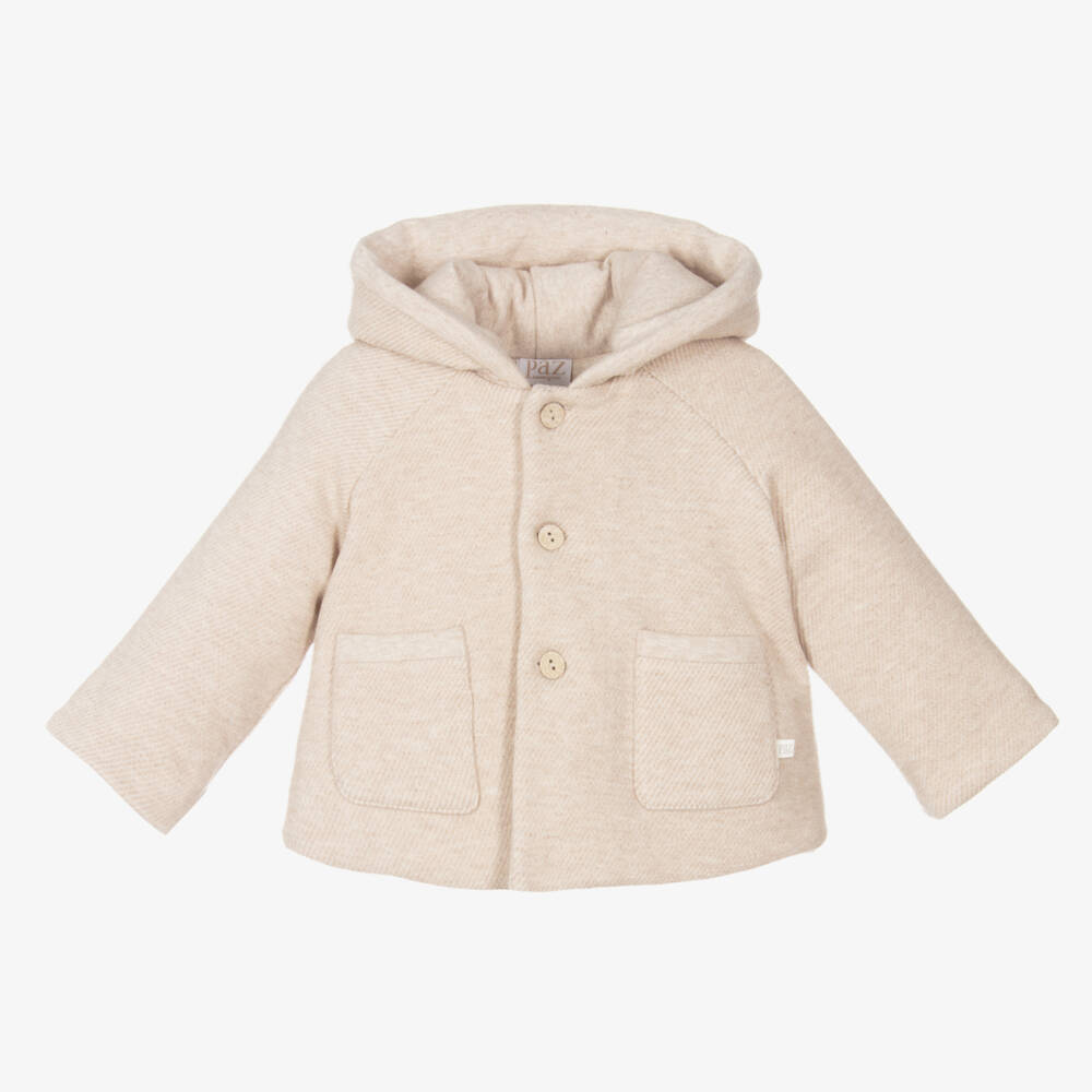 Sweet beige jacket for baby boys by Paz Rodriguez, made in soft polycotton jersey. Thick and cosy, this button fastening hooded jacket has two front pockets, one with an embroidered white logo tab.