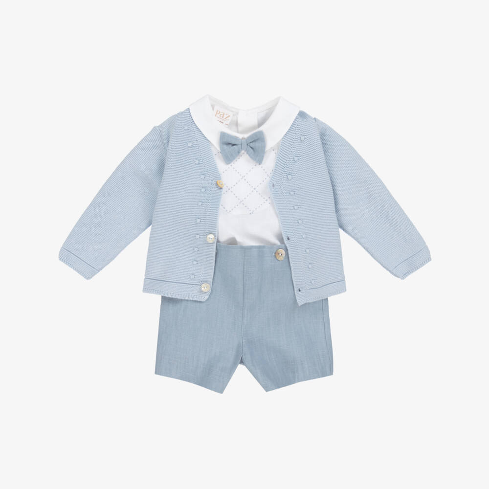 A traditionally styled ivory and blue shorts set for baby boys by Paz Rodríguez, ideal for a smarter occasion. The linen blend shirt has an attached bow tie and embroidery detailing. It attaches to the coordinating shorts with branded mother-of-pearl buttons for a neat, tucked-in look. A softly knitted cardigan completes the charming outfit.