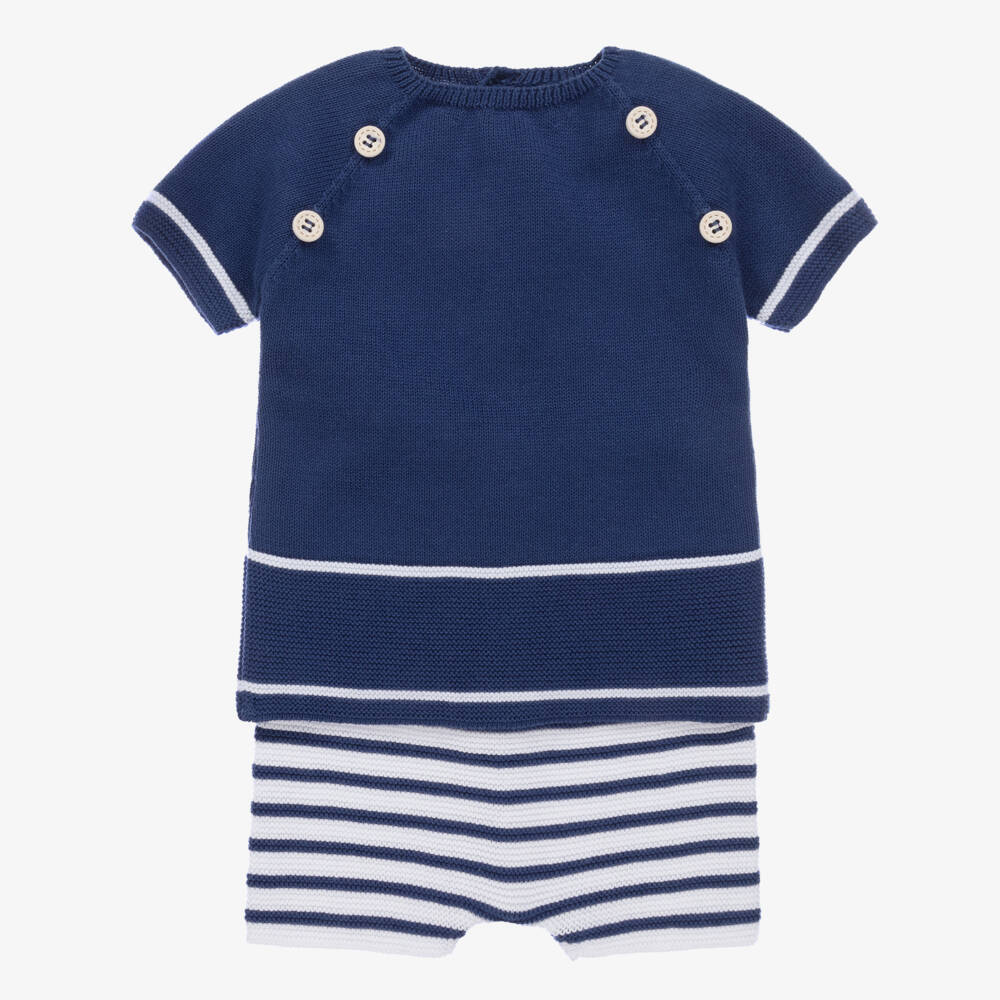 Sweet navy blue knitted shorts set for baby boys, by Paz Rodriguez. Made in beautifully soft organic cotton, it has white piped trims and ivory button detailing on the shoulders. It fastens with useful buttons on the back for easy dressing. It comes with nautical-inspired striped shorts for an adorable look.