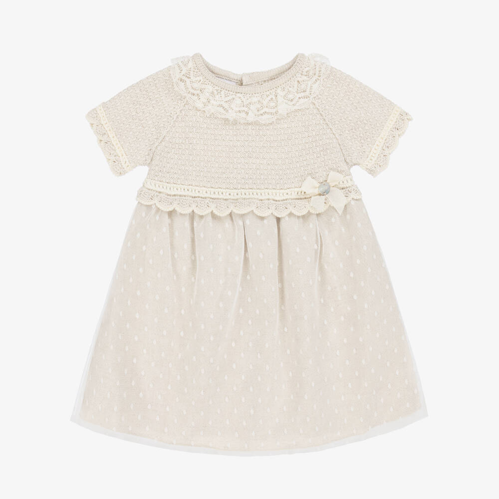 Baby Girls Beige Tulle & Cotton Knit Dress