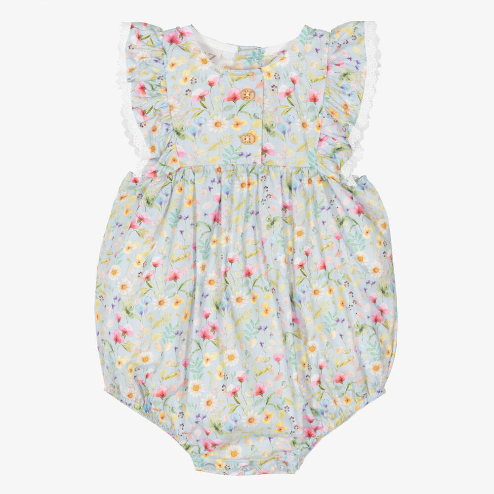 A pale blue shortie for baby girls by Paz Rodriguez with a pretty floral print. Made in soft and lightweight cotton, this charming one-piece has delicate white lace trims and decorative buttons on the bodice. There are buttons on the back to fasten and between the legs for easy dressing and changing.
