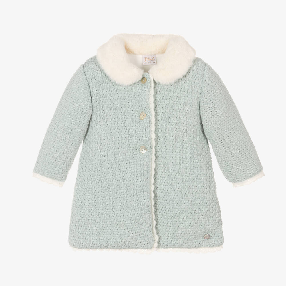 Pale aqua green softly knitted coat for baby girls by Spanish label Paz Rodriguez. Traditionally styled, this cosy coat has a super soft faux fur collar and a pretty scalloped knit trim. Lined in soft velour for extra warmth, it fastens with mother-of-pearl branded buttons on the front. A delicate logo charm stitched just above the hem adds a sweet designer finish.