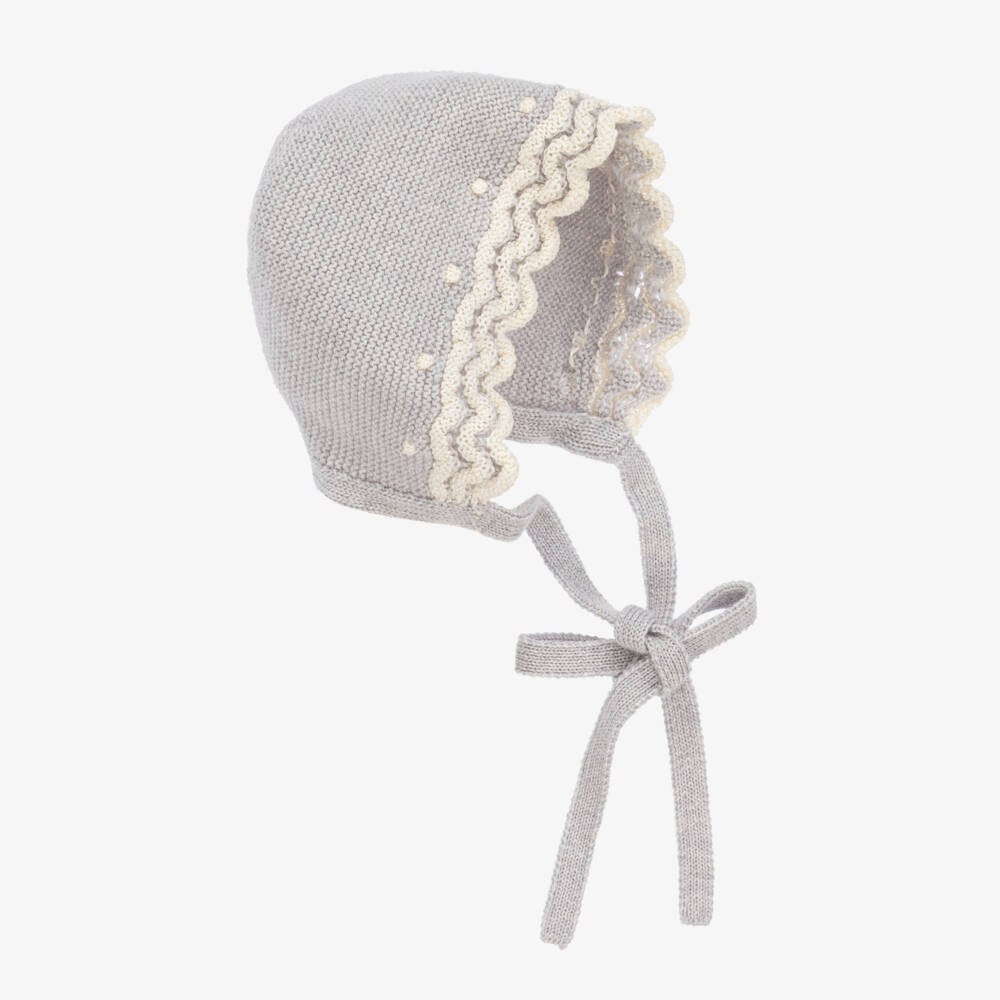 A pretty grey bonnet for baby girls from Paz Rodriguez, knitted from extra fine Merino wool. So lovely with ivory dots and scalloped trim knitted on the brim, it has a mother-of-pearl logo disc stitched on a velvet bow on one side. It ties under the chin to keep it securely in place.