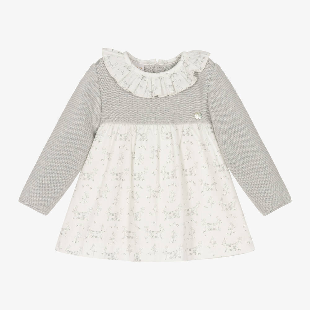 So sweet for baby girls, this grey and white dress is by Spanish brand, Paz Rodríguez. It has a cosy grey wool knit bodice with long sleeves, a ruffled collar and a mother-of-pearl logo charm. Patterned with adorable laundry lines and cute mice, the lightweight white cotton twill skirt has a soft lining for comfort. The dress fastens with neat buttons on the back and comes with matching knickers to complete the look.