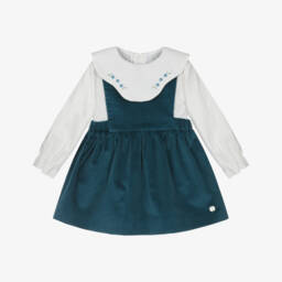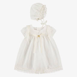 Sweet and traditional, this ivory dress and bonnet set for baby girls is by PAZ Rodríguez. Woven in soft cotton with a delicate check design, the dress is styled with a smocked neckline and delicate lace trims. It is lined in lightweight voile and fastens neatly on the back with buttons. A matching bonnet with ties to secure under the chin completes the classic, timeless look.
