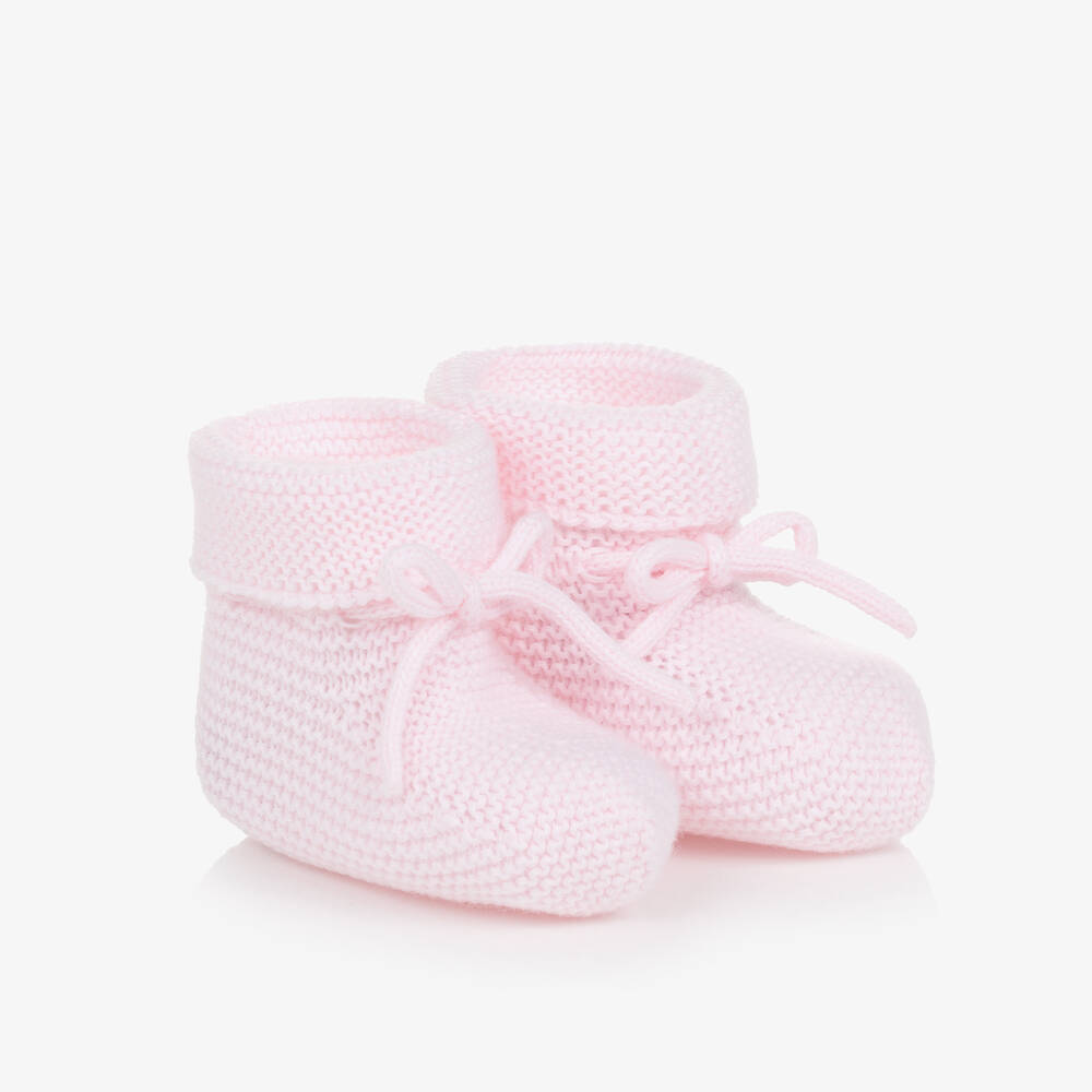 Pale pink booties for baby girls by classic Spanish designer Paz Rodriguez. Knitted in beautifully soft cotton, they have fold-over cuffs and a tie fastening on the front for a secure fit and sweet finish.