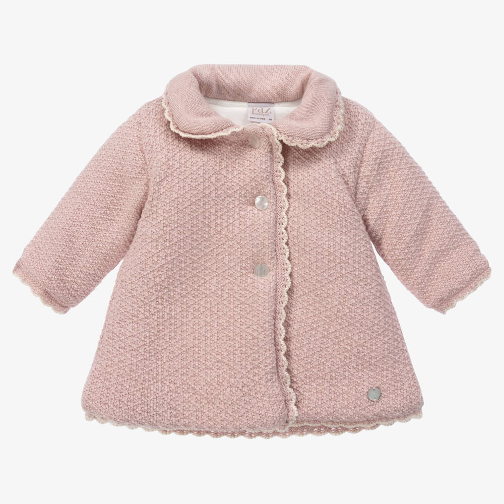 A sweet pale pink coat for baby girls by Paz Rodriguez, knitted in a delicate cotton and cashmere blend. Softly padded, this warm coat has a plush towel lining, with jersey lined sleeves. The Peter Pan collar, ivory scalloped trims and pearlescent button fastenings add classic charm to the look. A mother-of pearl logo is featured on the hem for a delightful finish.