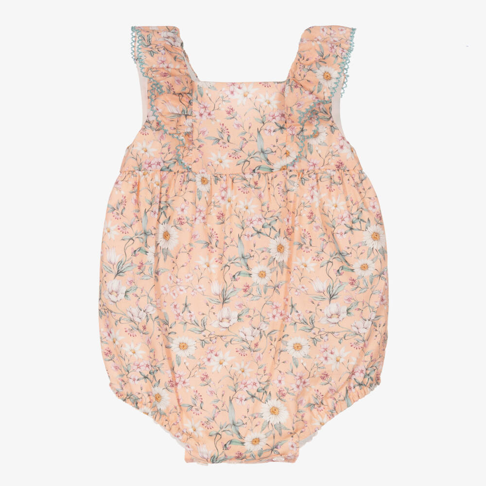 Baby girls coral pink cotton shortie by Paz Rodriguez, with a colourful all-over daisy print. Summery in style, there are shoulder ruffle trims, with contrast green picot edges. Lined with voile, it fastens on the back with a zip and between the legs with buttons.