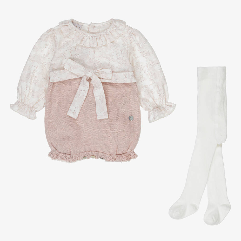 A sweet pink shortie set for baby girls by Paz Rodríguez, made in a beautiful cotton and cashmere blend. In a soft muted hue, the long-sleeved bodice is patterned with a wild flower meadow print with ducks and trees incorporated into the design. It has a sweet frilly collar and a decorative bow on the front. For contrast, the lower body is made in a soft and stretchy knit with mother-of-pearl buttons between the legs. The shortie comes with a pair of ivory tights, knitted in a comfortable cotton blend for more coverage in cooler weather.