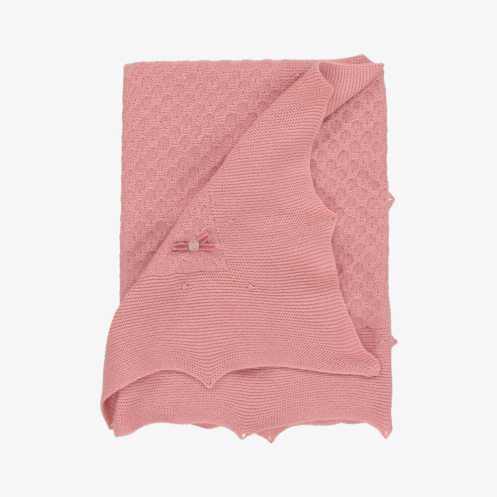 A delightful pale pink shawl for baby girls by Paz Rodríguez. Made from a super soft Merino wool knit, it has a charming jacquard diamond pattern and a wide border with a pretty pointed-edge design. Lovely for the nursery or to wrap baby in, it is stitched with a mother-of-pearl logo charm on one corner for an added branded touch.