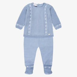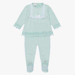 Beige two piece babygrow for boys and girls by Spanish brand Paz Rodríguez, made in a soft cotton knit. The top is designed in a pretty lacy knit with scalloped edges, a lace trim around the neck and a bow and mother-of-pearl logo charm by the hem. It fastens with buttons on the back. The bottoms have a gently elasticated waist for comfortable wear.