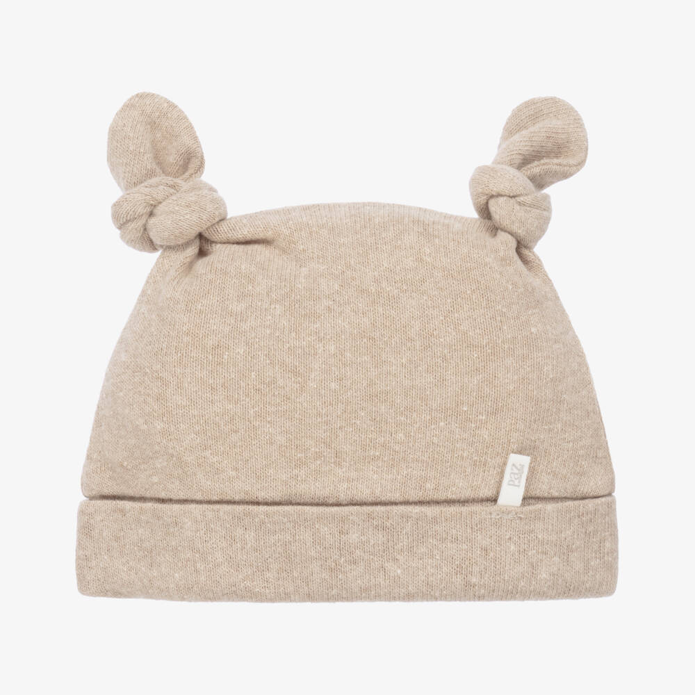 A softly knitted hat for baby boys and girls from Spanish designer Paz Rodriguez, in deep beige. It has a turn-up brim and two knots on the top designed to look like cute teddy bear ears. With a cosy, fleecy-feel underside, it has a logo tab to complete the style.