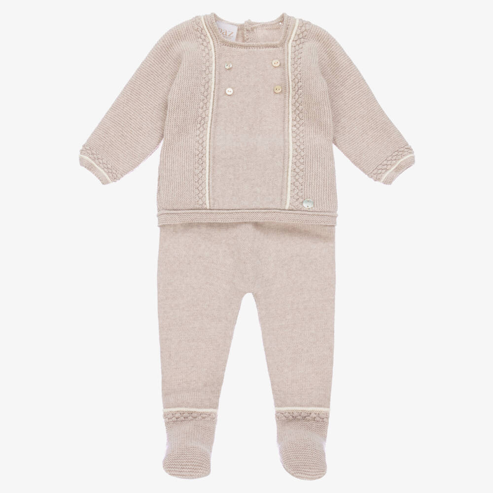 Beige two-piece babygrow for boys and girls by Paz Rodriguez, knitted in super-soft, extra-fine merino wool. The upper half has a smart square neckline, ivory knitted stripes and decorative mother-of-pearl buttons. It is detailed with a logo charm above the hem and fastens with tonal buttons on the back for a neat look. Designed with matching ivory stripes, the bottoms have a stretchy waist, soft and gentle on tiny tummies.